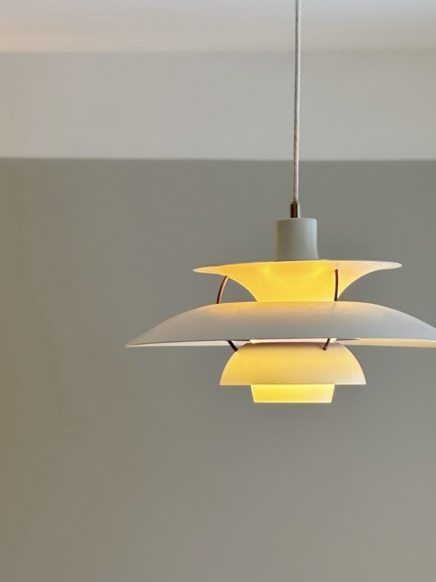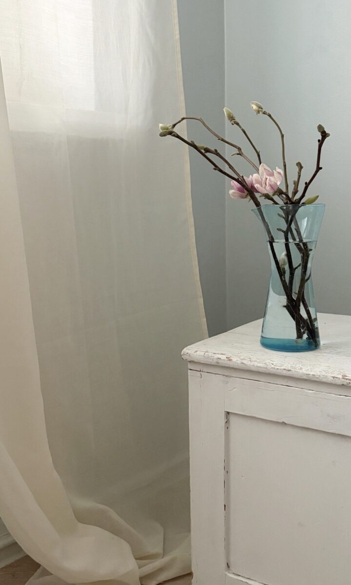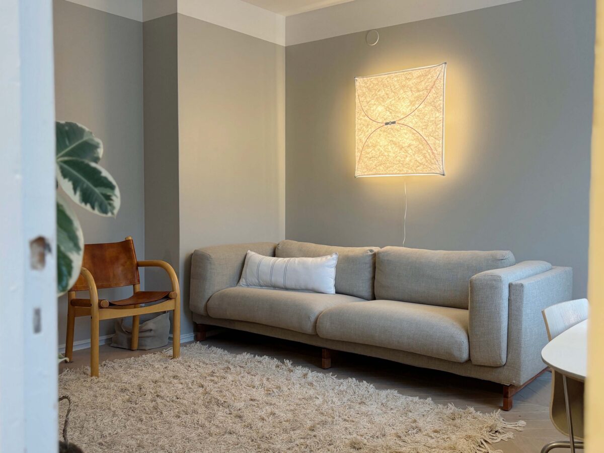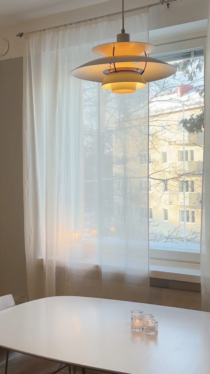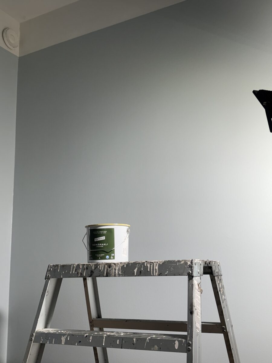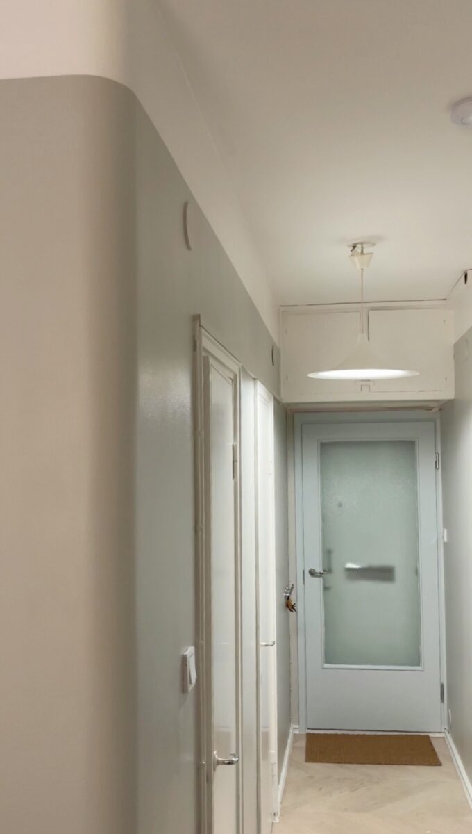 Asunnon korkea huonekorkeus haluttiin säilyttää kevyenä ja ilmavana. Seiniin maalattiin 25 cm korkea valoraja Virtasen seinämaalilla Tikkurilan Paperi-sävyssä. Vaalea rajaus keventää kokonaisuutta ja antaa tilalle hengittävyyttä ilman, että mittasuhteet rikkoutuvat.